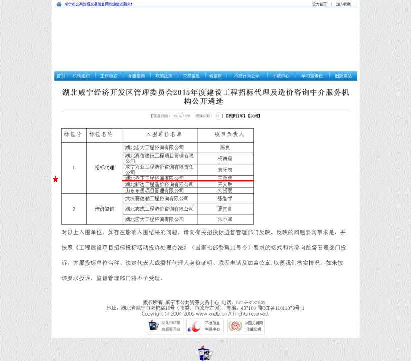 【經(jīng)營成果】我司入圍湖北咸寧經(jīng)濟(jì)開發(fā)區(qū)管理委員會(huì)2015年度建設(shè)工程招標(biāo)代理及造價(jià)咨詢中介服務(wù)機(jī)構(gòu)庫招標(biāo)代理單位