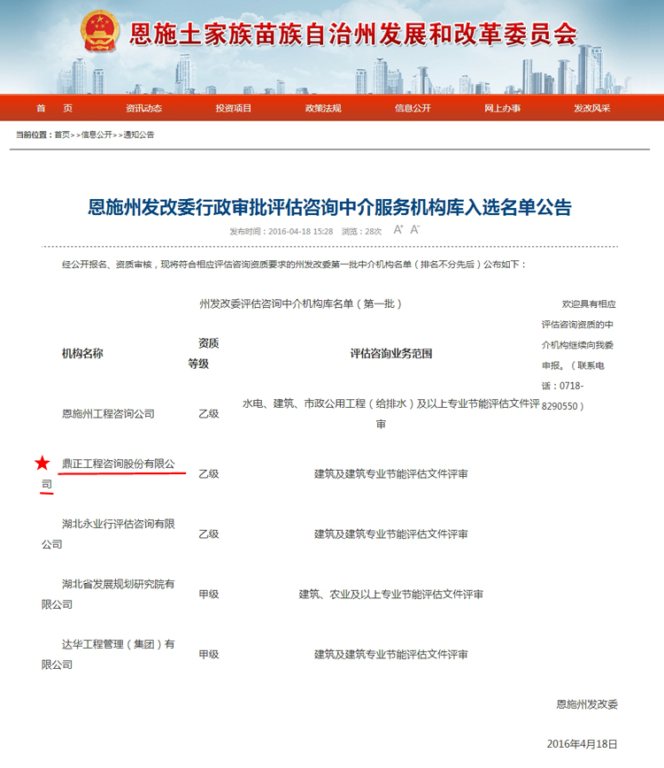 【經(jīng)營成果】我司入圍恩施州發(fā)改委行政審批評(píng)估咨詢中介服務(wù)機(jī)構(gòu)庫