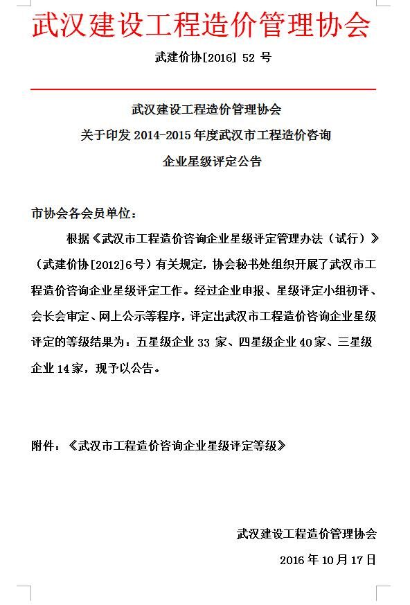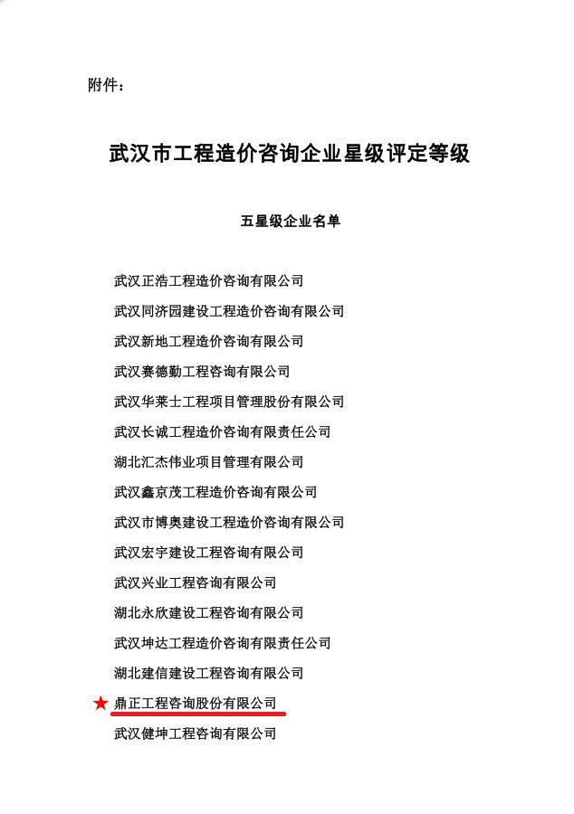 我司獲武漢市工程造價(jià)咨詢企業(yè)星級評定五星級企業(yè)稱號