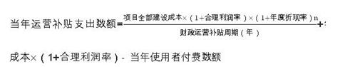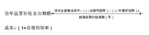 對(duì)可行性缺口補(bǔ)助模式的項(xiàng)目,在項(xiàng)目運(yùn)營(yíng)補(bǔ)貼期間,政府承擔(dān)部分直接付費(fèi)責(zé)任。政府每年直接付費(fèi)數(shù)額包括:社會(huì)資本方承擔(dān)的年均建設(shè)成本(折算成各年度現(xiàn)值)、年度運(yùn)營(yíng)成本和合理利潤(rùn),再減去每年使用者付費(fèi)的數(shù)額。計(jì)算公式為: