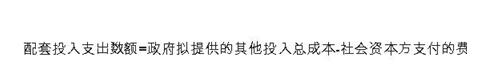 第二十二條 配套投入支出責(zé)任應(yīng)綜合考慮政府將提供的其他配套投入總成本和社會(huì)資本方為此支付的費(fèi)用。配套投入支出責(zé)任中的土地等實(shí)物投入或無形資產(chǎn)投入,應(yīng)依法進(jìn)行評(píng)估,合理確定價(jià)值。計(jì)算公式為: