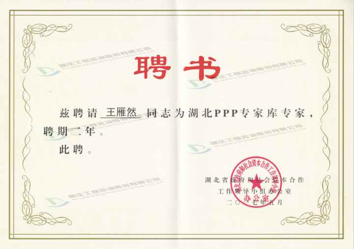 近日,湖北省政府和社會(huì)資本合作工作領(lǐng)導(dǎo)小組辦公室授予鼎正公司董事長(zhǎng)王雁然先生、副總經(jīng)理兼技術(shù)總監(jiān)朱立冬教授為湖北省PPP專家?guī)鞂<?。此?/SPAN>,我司王雁然先生、朱立冬教授、張宏亮先生已入選湖北省財(cái)政廳PPP專家?guī)鞂<?,另外,王雁然先生還被崇陽(yáng)縣人民政府聘為崇陽(yáng)縣PPP項(xiàng)目專家顧問(wèn)。
