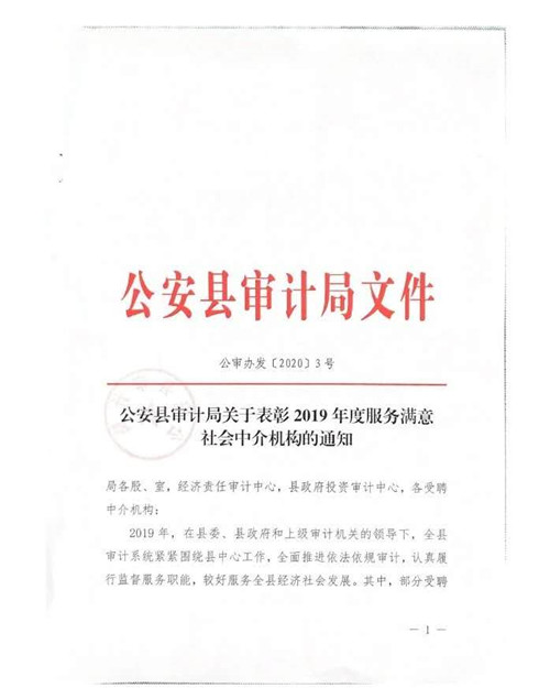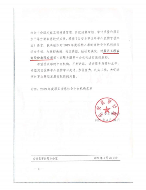 自2019年7月1日鼎正咨詢成為公安縣審計(jì)局的入庫(kù)合作單位以來(lái),荊州分公司同事們?cè)诠こ炭⒐そY(jié)算審計(jì)過程中,精心組織、合理安排、嚴(yán)于律己、廉潔從審,在確保重點(diǎn)工程順利推進(jìn)、節(jié)約政府資金、提高投資效益等方面做出了突出貢獻(xiàn),得到了公安縣相關(guān)單位的一致好評(píng),為公司贏得了信譽(yù)。