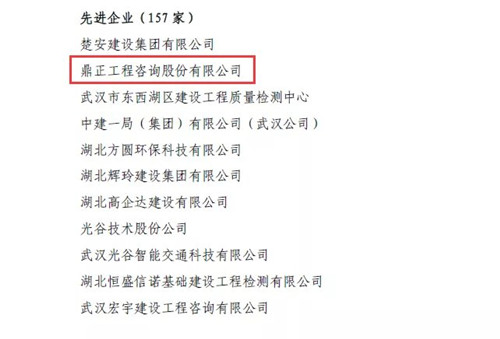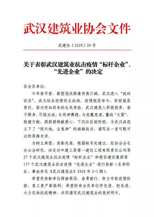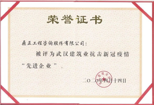 4月14日,武漢建筑業(yè)協(xié)會發(fā)布《武建協(xié)〔2020〕20 號——關(guān)于表彰武漢建筑業(yè)抗擊疫情“標桿企業(yè)”、“先進企業(yè)”的決定》,對在抗疫“主戰(zhàn)場”積極擔(dān)責(zé),奮不顧身、盡銳出戰(zhàn),與死神賽跑、與疫魔競速的27家武漢建筑業(yè)“標桿企業(yè)”、157家“先進企業(yè)”進行表彰。鼎正咨詢因在武漢抗擊疫情過程中表現(xiàn)突出,獲評“先進企業(yè)”榮譽稱號。